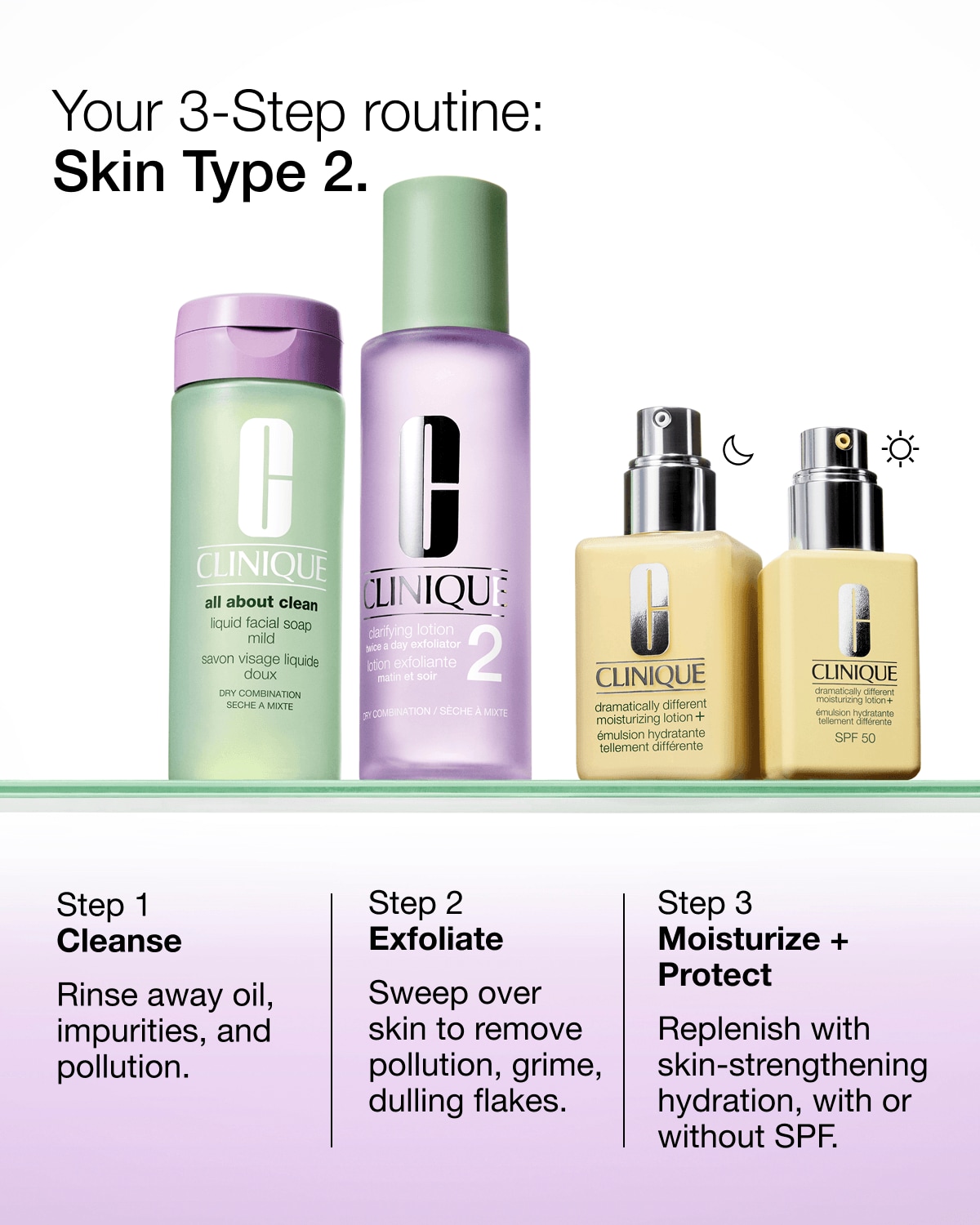 La lotion clarifiante 2 exfolie en douceur la peau sèche à mixte. Offre instantanément des bienfaits éprouvés en clinique* pour une peau :