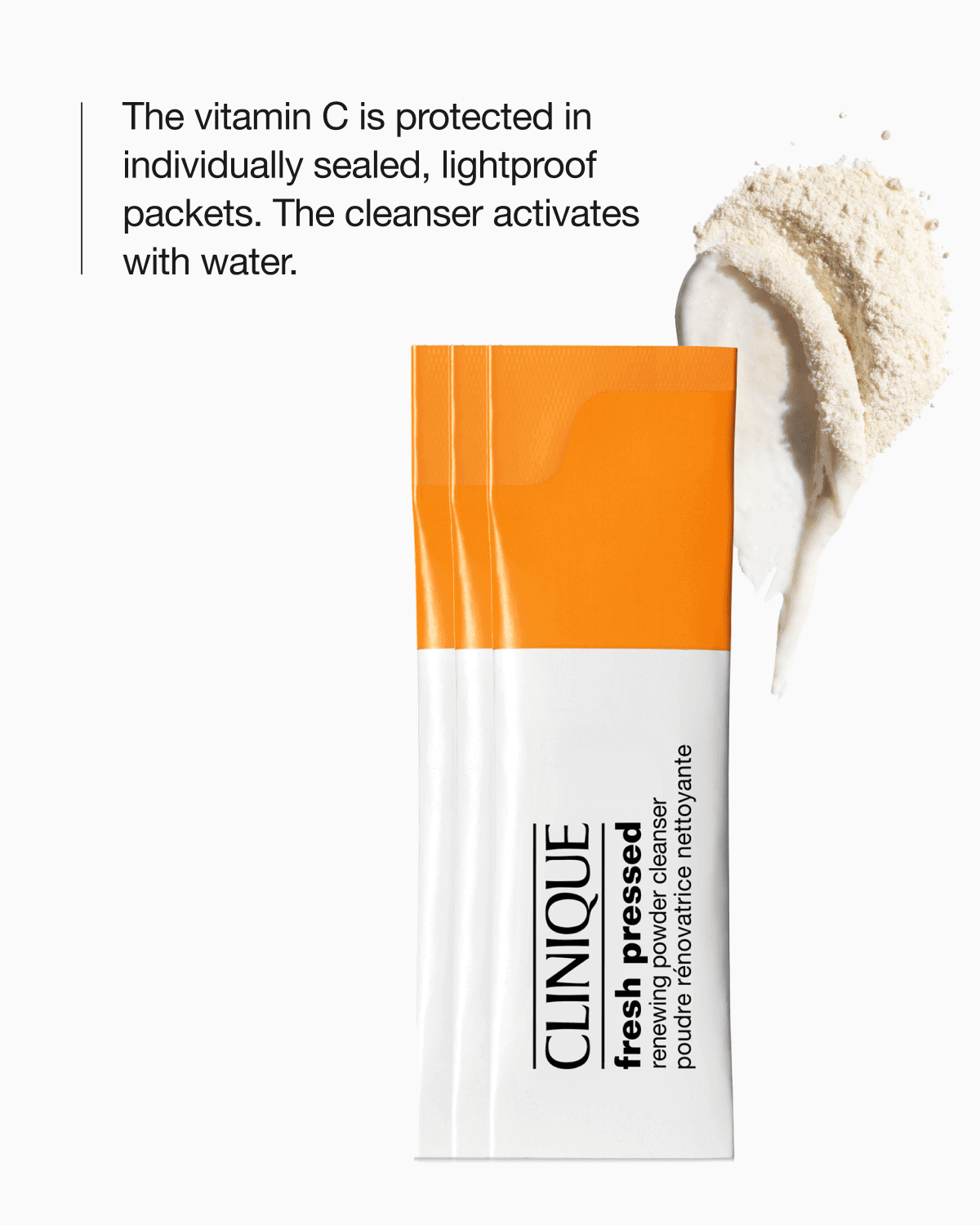 Accueil / Fresh Pressed Nettoyant en poudre renouvelant avec vitamine C pure Clinique Fresh Pressed™ Soyez le premier à laisser un avis Préoccupation de peau Anti-âge Avantages Aide à éclaircir et régénérer l’apparence de la peau. Principaux ingrédients 10 % de vitamine CPour donner un coup d’éclat à la peau.Faits concernant la formuleExpertise cliniqueTesté par des dermatologuesSoumis à des tests d’allergieSans parfumSansParfumParabènePhtalateGlutenHuileAlcool qui dessècheCouleurs synthétiquesLaurylsulfate de sodiumLaureth sulfate de sodium Type de peau Très sèche à sèche, sèche à mixte, mixte à grasse, grasse 55,00 $ CA41,25 $ CA 28 paquets28 paquetsS'inscrire Expédition gratuite des commandes d’abonnement. Quantité 1 Chargement...Détails du produitNettoyant pour le visage en poudre activé par l’eau avec de la vitamine C fraîche. Purifie, illumine et redonne de la texture à la peau.Testé par des dermatologues. Soumis à des tests d’allergie. 100 % sans parfum.Partagez l’amour.Montrez-nous vos favoris Clinique.